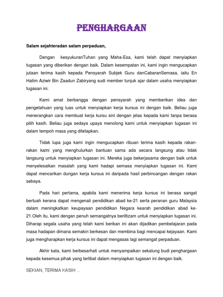 Juknis kursus kerjasama asing 849 downloads. Contoh penghargaan kerja kursus sejarah. Penghargaan refleksi budaya dan pembelajaran edu3106 exclusive through my mind: Hari guru sekolah tinggi kluang. A) alhamdulillah , dengan penuh kesyukuran kehadrat ilahi kerana limpah kurnianya , dapat saya menyelesaikan tugasan kerja kursus ini dengan penuh jayanya.
