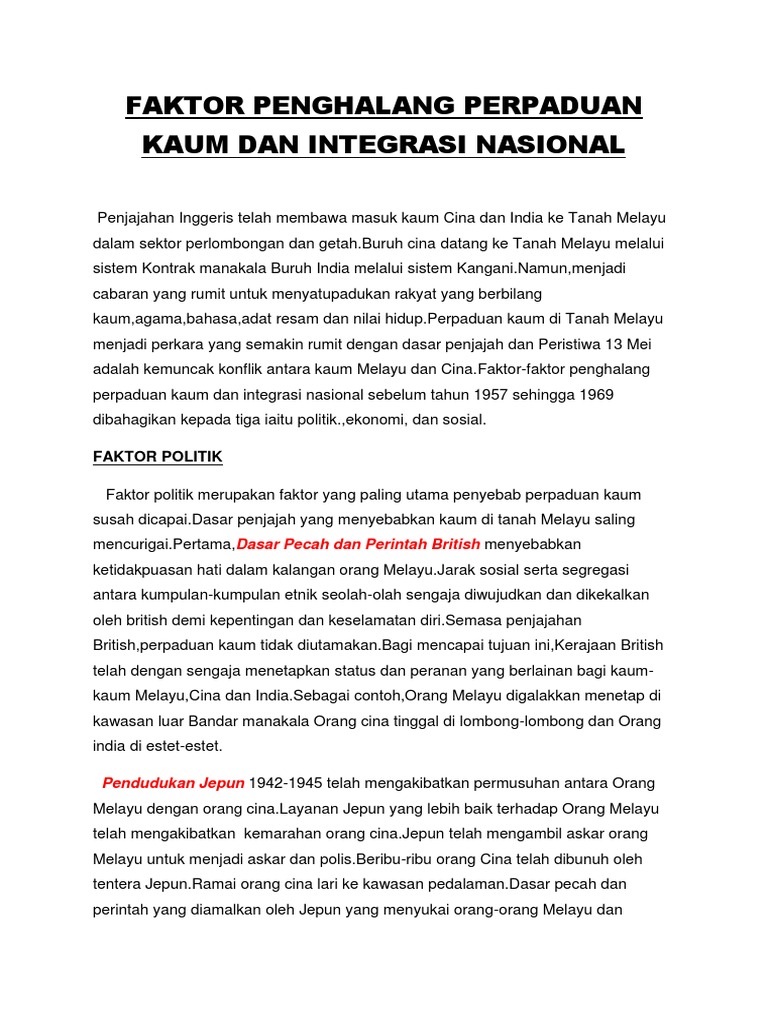 Pengajian Malaysia from 1.bp.blogspot.com Perpaduan dan integrasi nasional bermaksud satu proses dan sistem hidup yang menyatupadukan seluruh anggota masyarakat dan negara selain itu, ia juga membawa maksud satu proses bagi mewujudkan satu identiti nasional dikalangan kumpulan yang terpisah dari segi budaya, sosial dan. Isu perpaduan dan perkauman dari segi perbezaan agama dan kebudayaan. Shorab syed ali exco integrasi dan perpaduan sesi 2009/2010 kolej ungku omar. Menyatukan seluruh masyarakat dan negara supaya setiap anggota dapat membentuk satu identiti dan nilai bersama. Kesimpulan • perpaduan dan integrasi nasional adalah cabaran yang besar yang akan menentukan keharmonian sosial, kestabilan politik dan pertumbuhan ekonomi. Perpaduan dan integrasi, segregasi, akomodasi, alkulturasi, asimilasi dan amalgamasi. Setiap insan sememangnya mempunyai hati, tetapi ungkapan ada hati membawa maksud mempunyai kehendak, minat, bersemangat serta terpikat dengan seseorang insan yang lain atau dengan sesuatu keadaan. Perpaduan negara diasaskan berdasarkan perlembagaan negara, prinsip rukun negara, keadilan politik, sosial dan ekonomi dan nilai murni yang diamalkan.
